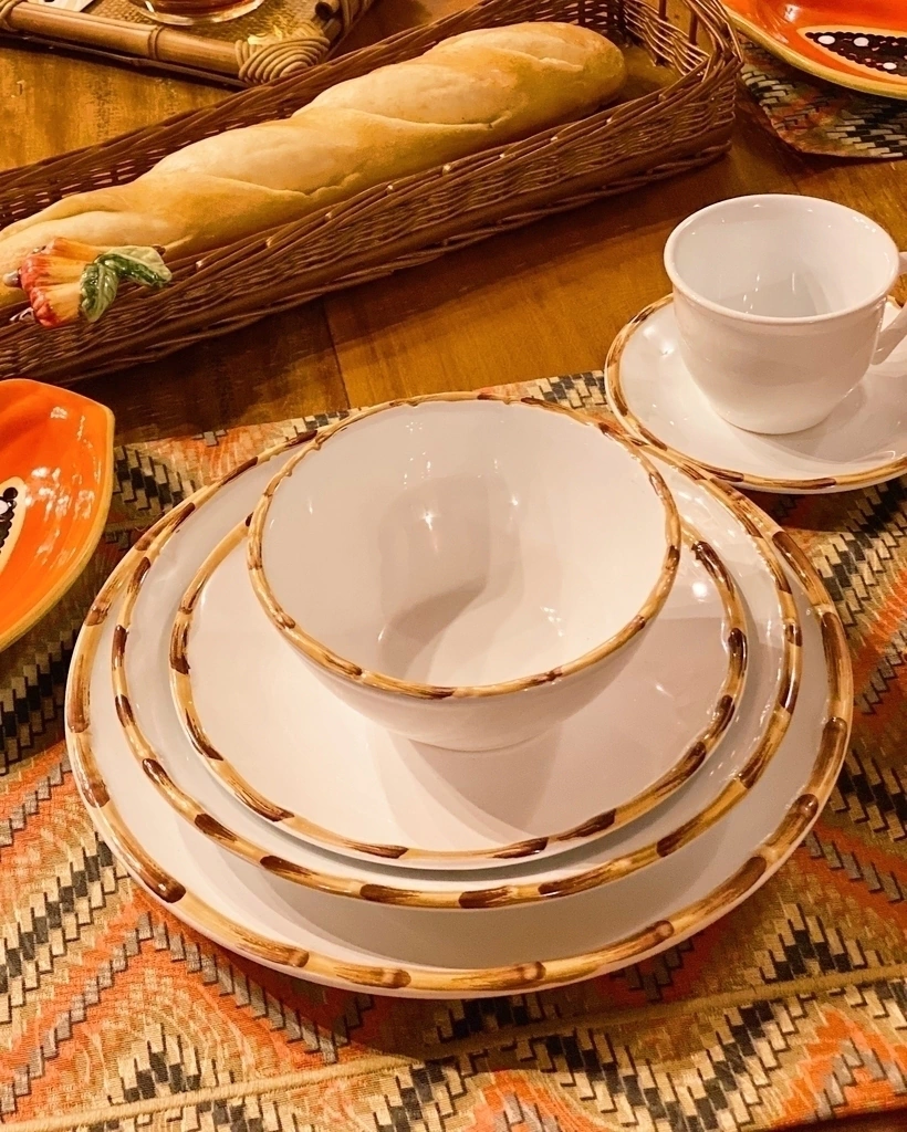 Jogo com 6 peças de pratos fundos de cerâmica pintados a mão nas bordas.